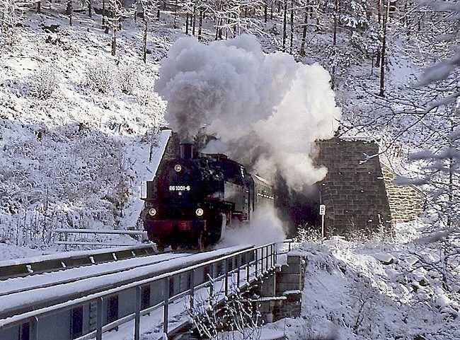 Organisator dieser Sonderfahrt war der Verein Sächsischer Eisenbahnfreunde (VSE). Während eines Fotohaltes ge- lang dieses Foto von 86 1001 mit dem Sonderzug aus Bghw-Wagen bei der Ausfahrt aus dem Bockauer Tunnel. Direkt neben mir stand damals der bekannte Eisenbahnfotograf Günther Feuereißen mit seiner Kamera. Allen Besuchern dieser Seite wünsche ich eine besinnliche Weichnachtszeit.