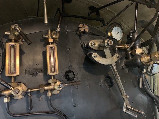 ![]() Der Blick auf den oberen Teil des Stehkessels mit den beiden Wasserstandsgläsern und dem Regler der Lokomotive