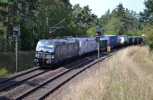 ![]() MRCE 193 875 "Connecting Europe" vor abgebügelter 193er von RTB Cargo mit KLV in Richtung Regensburg