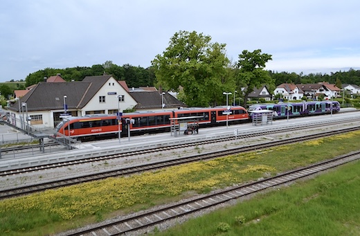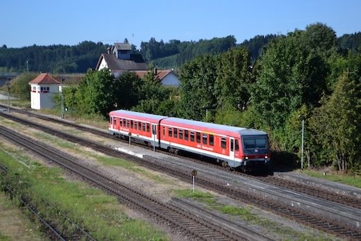 zwischen Traunstein und Hörpolding sowie zwischen Trostberg und Garching statt. Nähere Informationen kann man unter folgendem Link finden: Bahnstrecke Traunstein - Garching ![]() 628 591 als RB Mühldorf - Trostberg bei der Einfahrt in den Bahnhof Tüssling (04.08.2015)