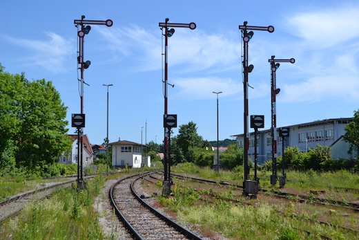 Ausfahrt des Bahnhofs Trostberg mit Formsignalen