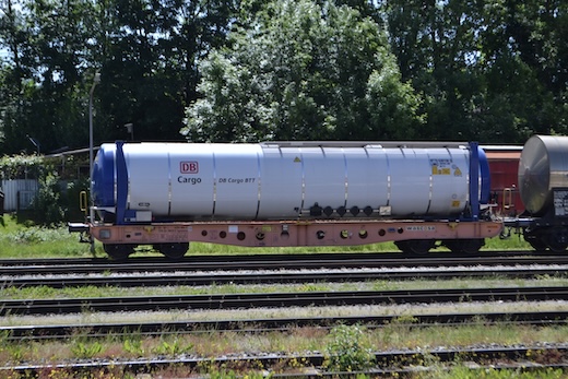 Sgmmnss 4594 084-7 mit DB Cargo Kesselauflieger im Bahnhof