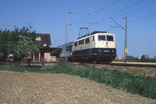 111 007 mit Interregio nach München bei Oberschleißheim (07.05.1994)