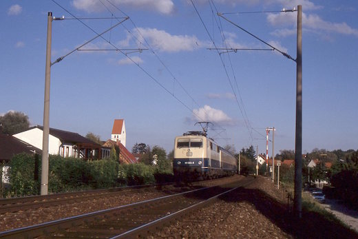 111 004 mit Reisezug in Richtung München bei Marzling (Herbst 1993)