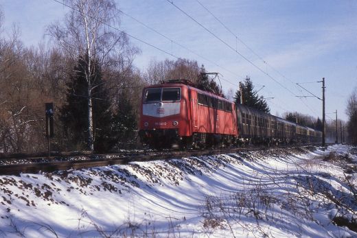 111 041 mit Regionalzug in Richtung München bei Freising (14.01.1995)