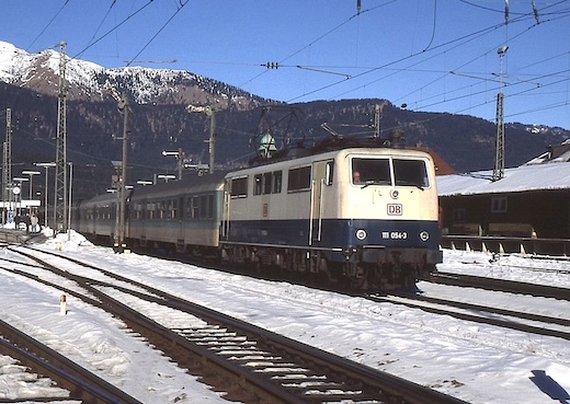 ![]() 111 193 mit einer ICE-Garnitur im Bahnhof Garmisch-Partenkirchen (1994)