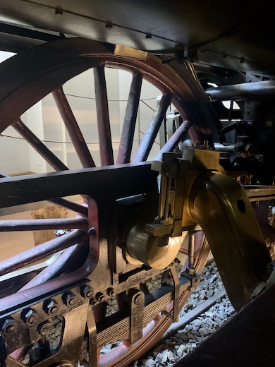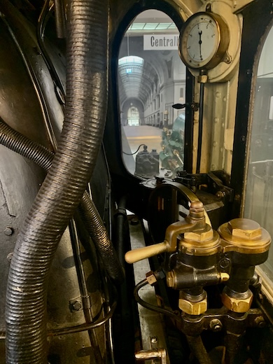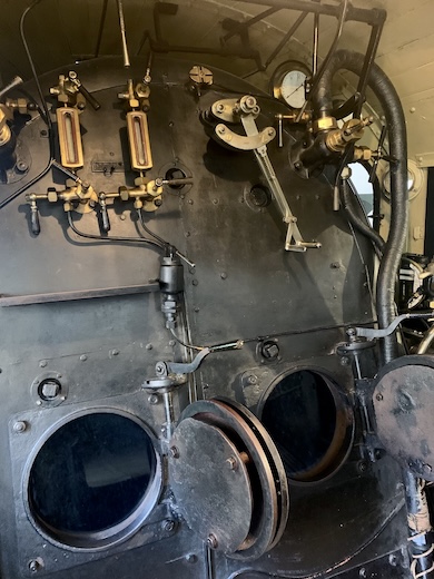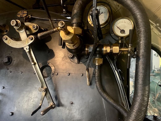 ![]() Der Blick auf den oberen Teil des Stehkessels mit den beiden Wasserstandsgläsern und dem Regler der Lokomotive