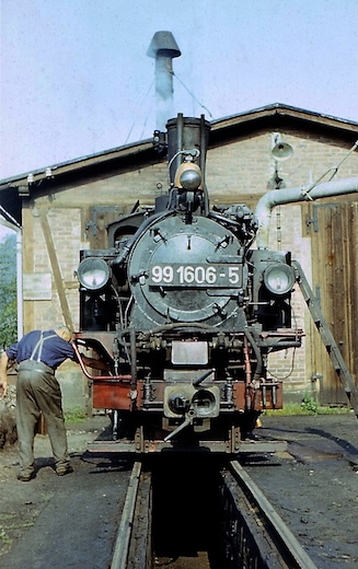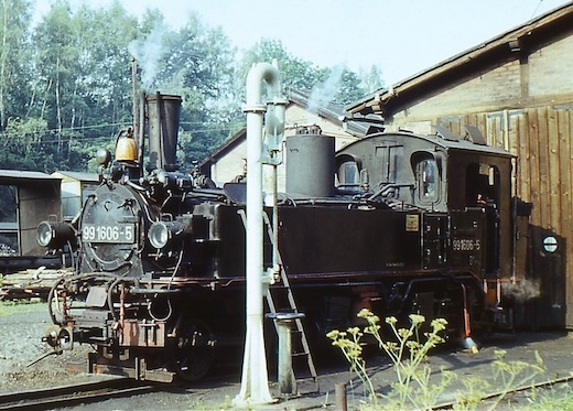 ![]() 99 1606 beim Wassernehmen vor dem Wolkensteiner Heizhaus (um 1980)