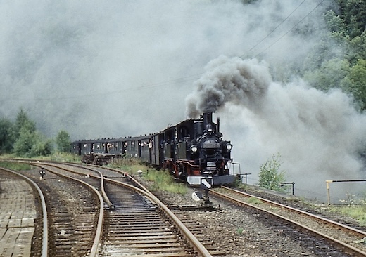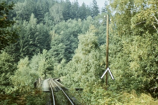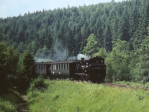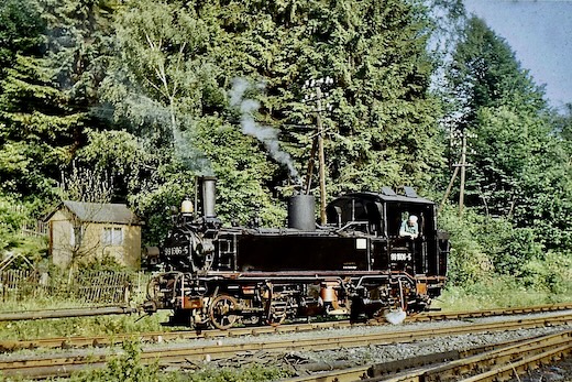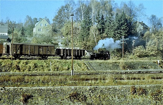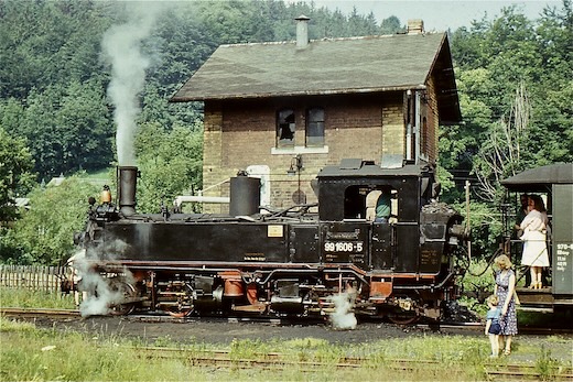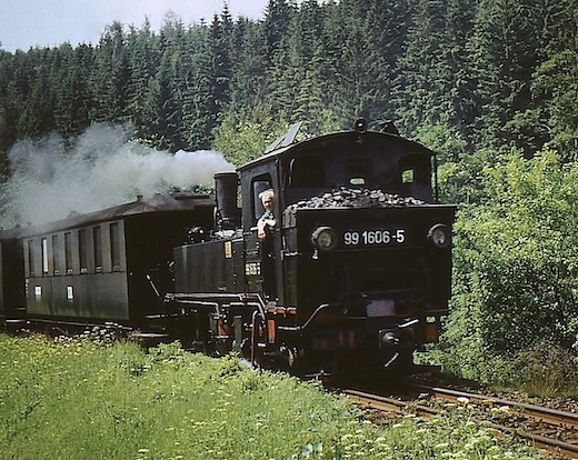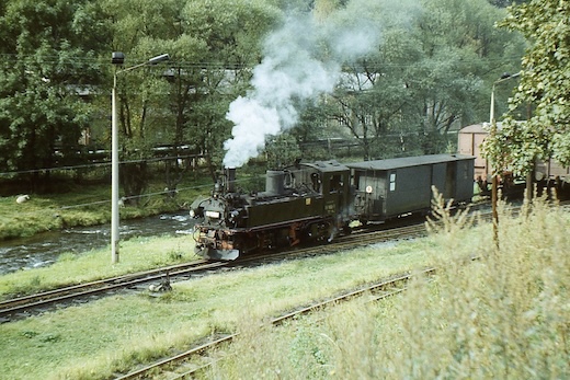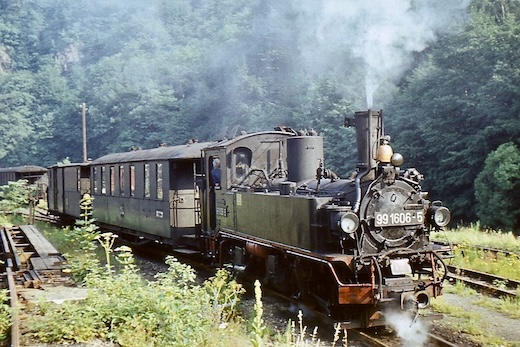 Irgendwo zwischen Wolkenstein und Jöhstadt muss mich in den späten 1970er Jahren der äußerst hartnäckige Virus "Eisenbahnfotografie" befallen haben. Bis heute habe ich es nicht geschafft (ich hab es auch nicht ernsthaft versucht), ihn loszuwerden. Die folgenden Bilder entstanden um 1980 bei einer Fahrt mit 99 1606 von Wolkenstein nach Jöhstadt, sowie Jahre später, ca. 1984 (leider sind mir die genauen Zeitangaben abhanden gekommen). Nun fuhren hier die Züge nur noch als GmP zwischen Wolkenstein und Niederschmiedeberg. Nur das dortige Kühlschrankwerk hielt die Bahn noch am Leben. Doch auch das war bald vorbei. Ende 1986 war die Bahn durch's Preßnitztal Geschichte. Welchen weiteren Verlauf diese nehmen sollte, ahnte damals noch niemand ...