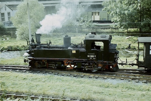![]() 99 1568, auch heute wieder im Preßnitztal auf der Museumsbahn unterwegs, im Bahnhof Niederschmiedeberg. Im Hintergrund das Kühlschrankwerk, letzter Arbeitgeber der Bahn