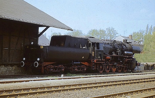 ![]() 52 8077 stand für Führerstandmitfahrten bereit. Die Reko-52er stand damals noch in regu- lären Diensten des Bw Engelsdorf. Sie ist heute im Besitz der "Dampfbahn Kochertal" und in Crailsheim konserviert abgestellt