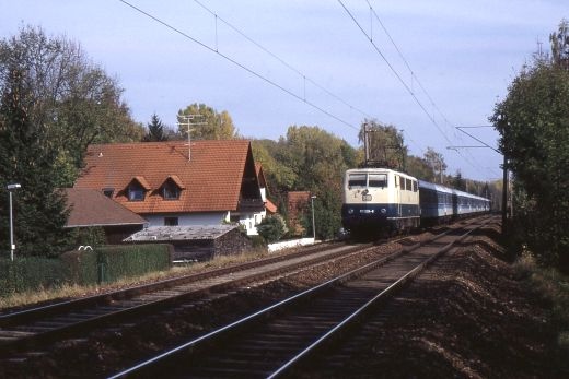 111 004 mit Reisezug in Richtung München bei Marzling (Herbst 1993)