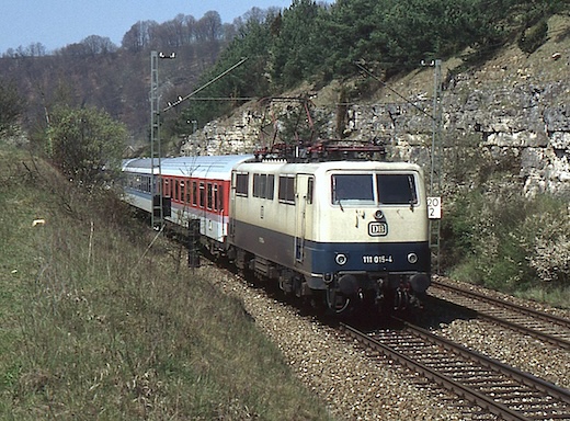 111 181 mit Interregio in Richtung Ingolstadt bei Dollnstein (25.04.1994)