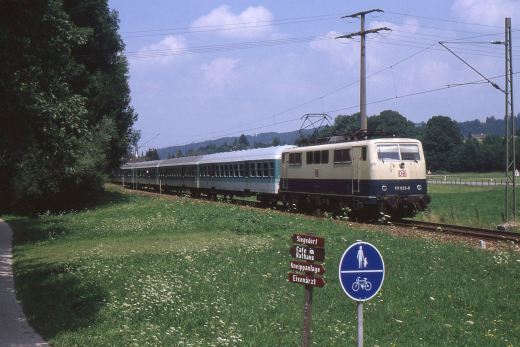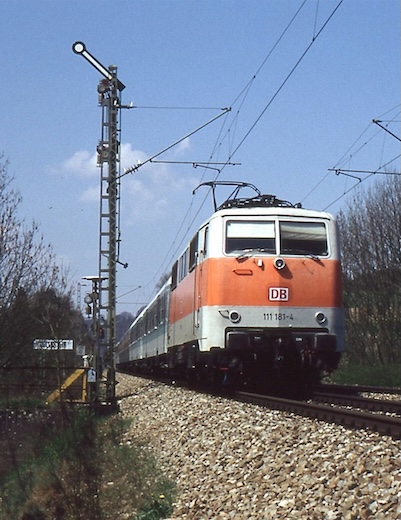 ![]() 111 068 mit Interregio nach München bei Oberschleißheim (07.05.1994)