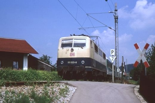 111 023 mit Regionalzug Traunstein - Ruhpolding bei Siegsdorf (1994)