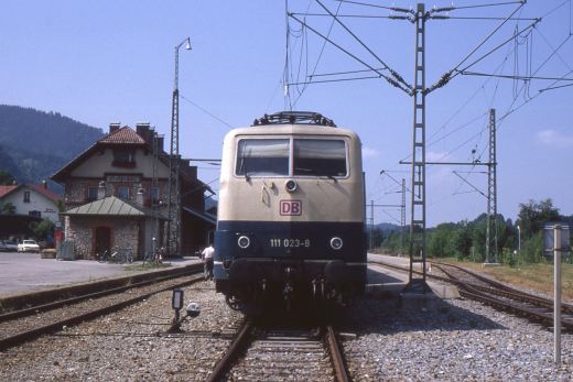 111 023 mit Regionalzug im Bahnhof Ruhpolding (1994)