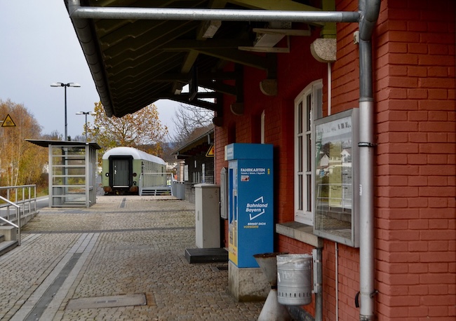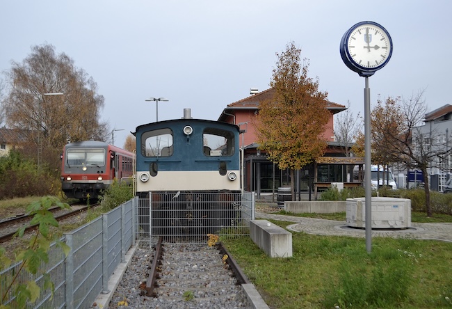 ![]() Bahnhof Bogen. Als Denkmal wurde die Köf 335 298, gebaut 1965 von O&K, hier aufgestellt